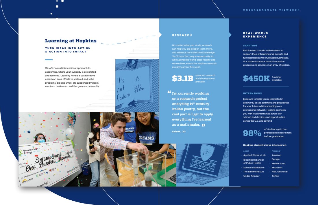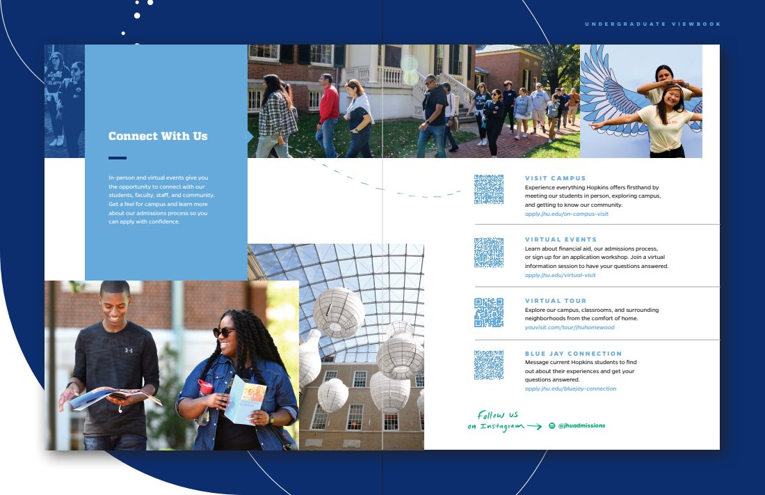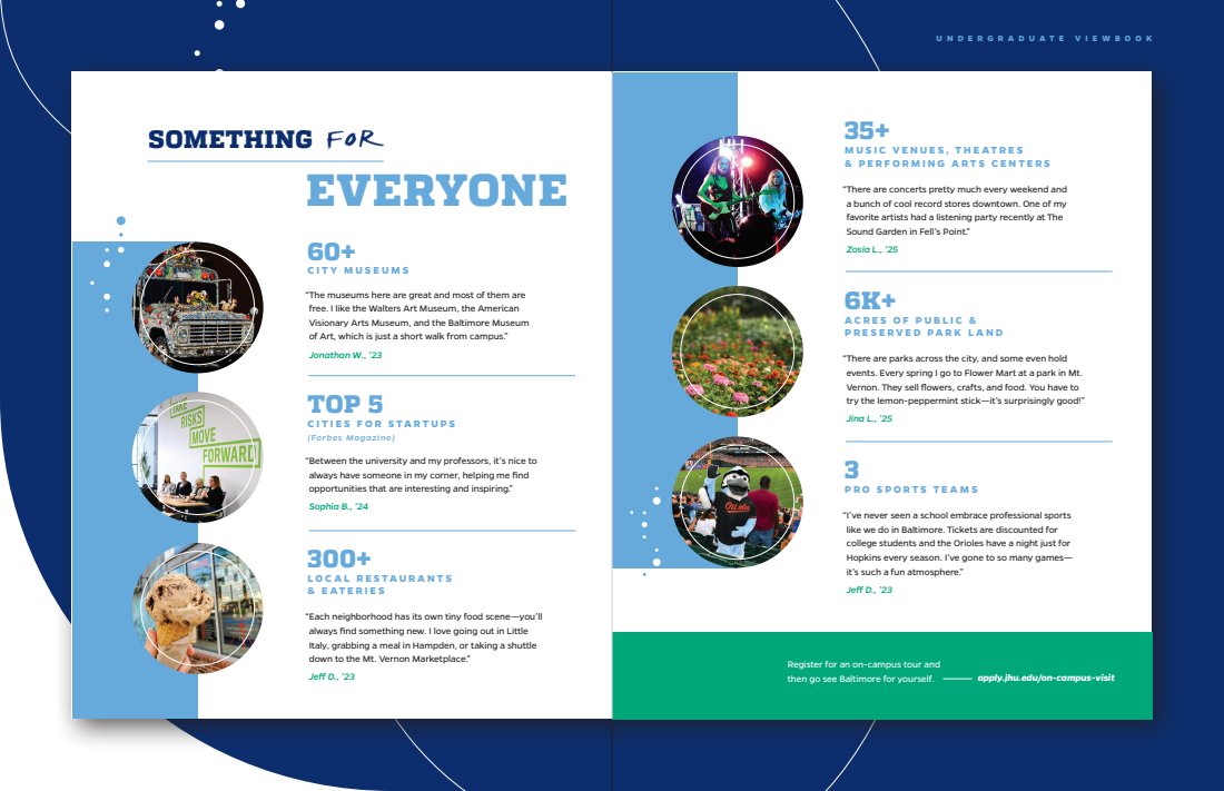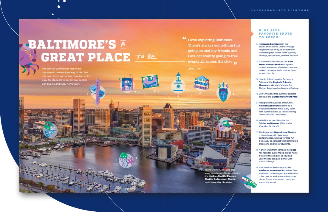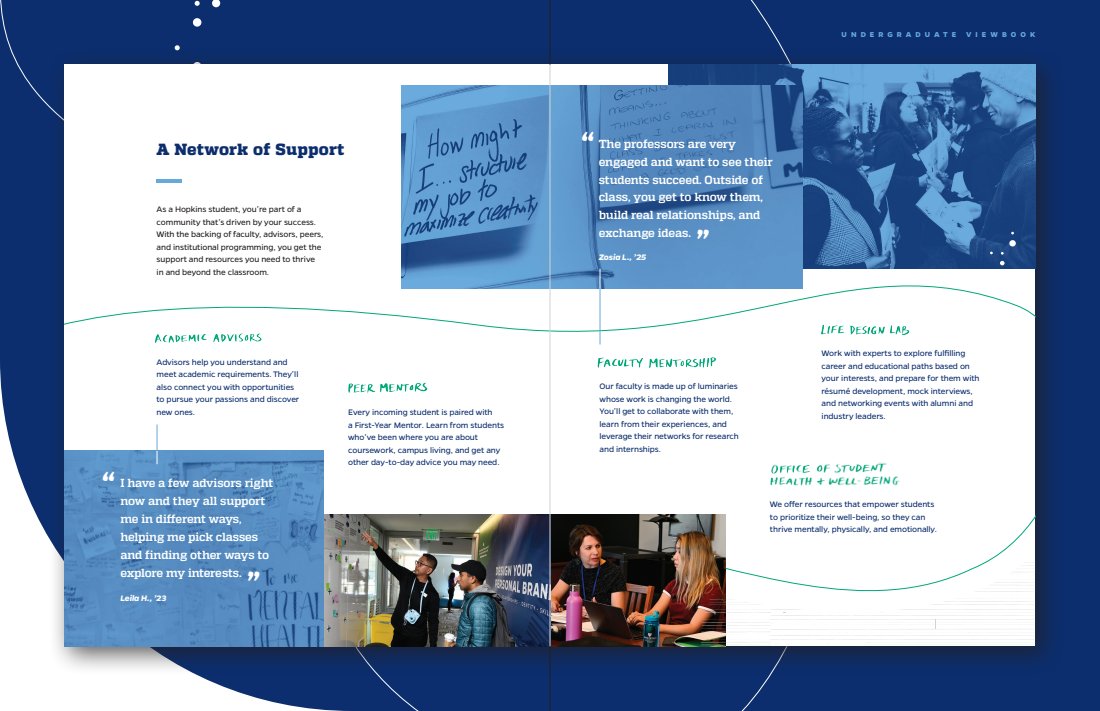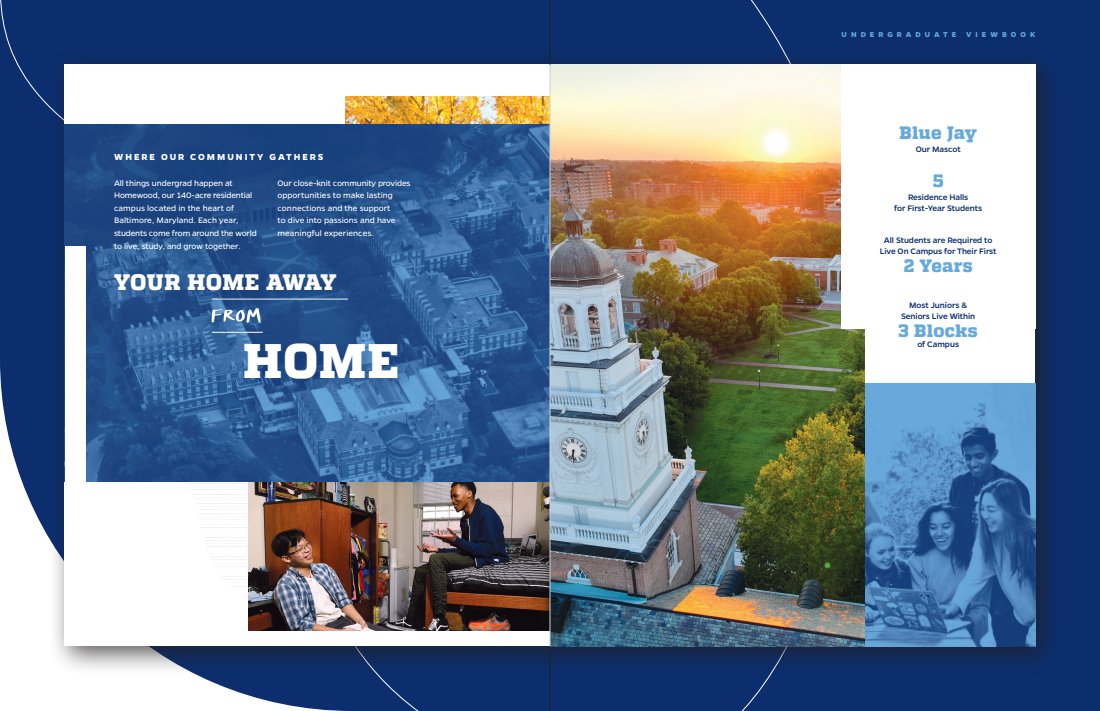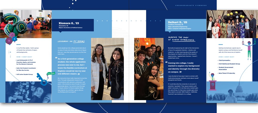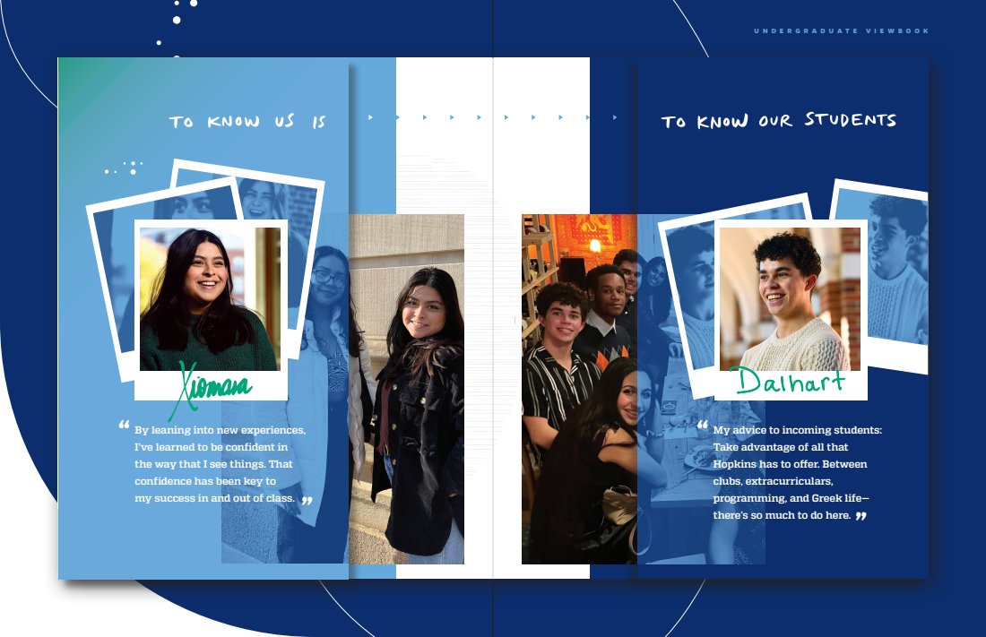 Every touchpoint is huge, but there’s nothing like a great first impression. The viewbook features a range of content describing JHU’s campus, culture, and community. I was able to sit down and interview current students, so a lot of what you’ll read is as authentic as it gets.