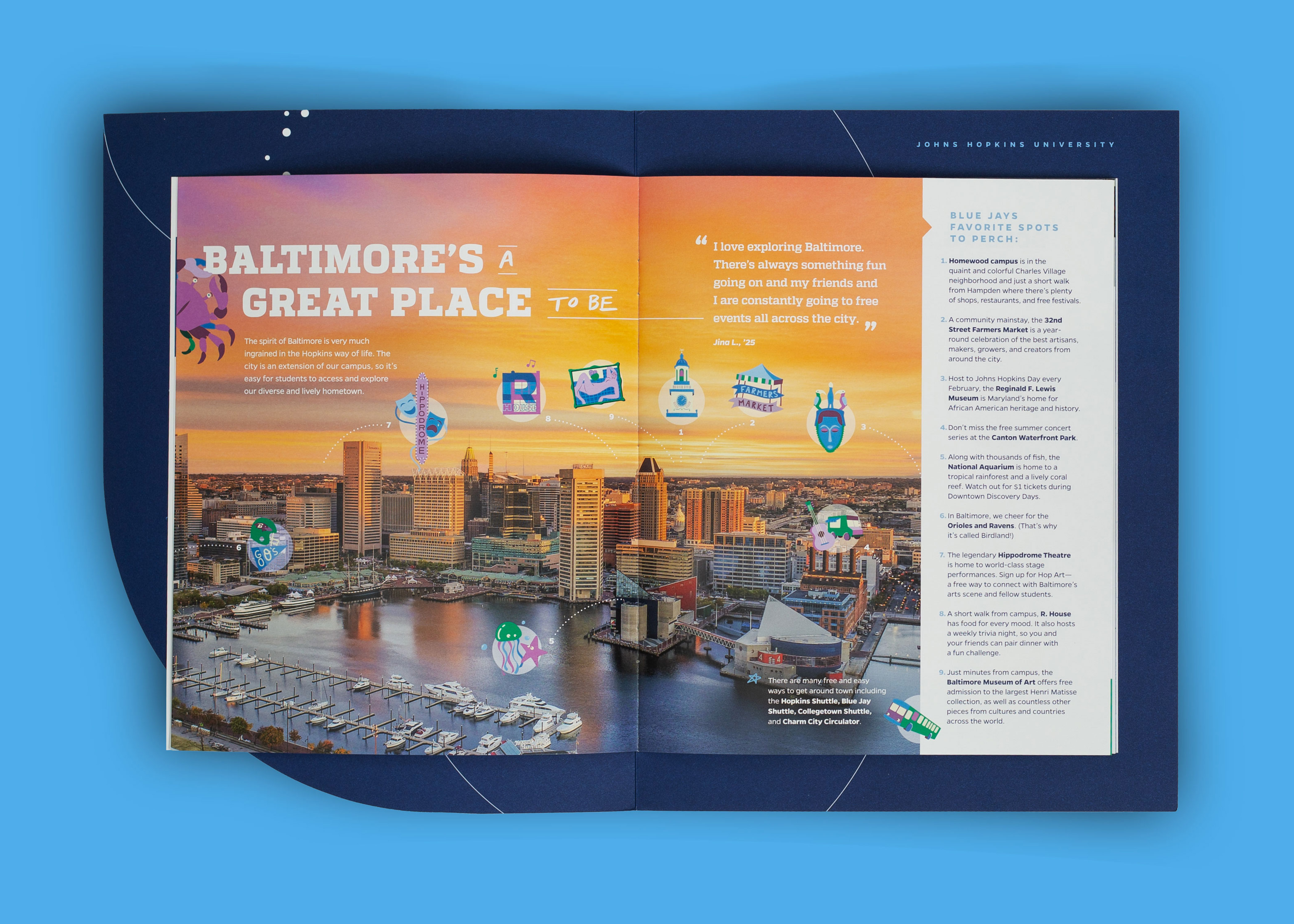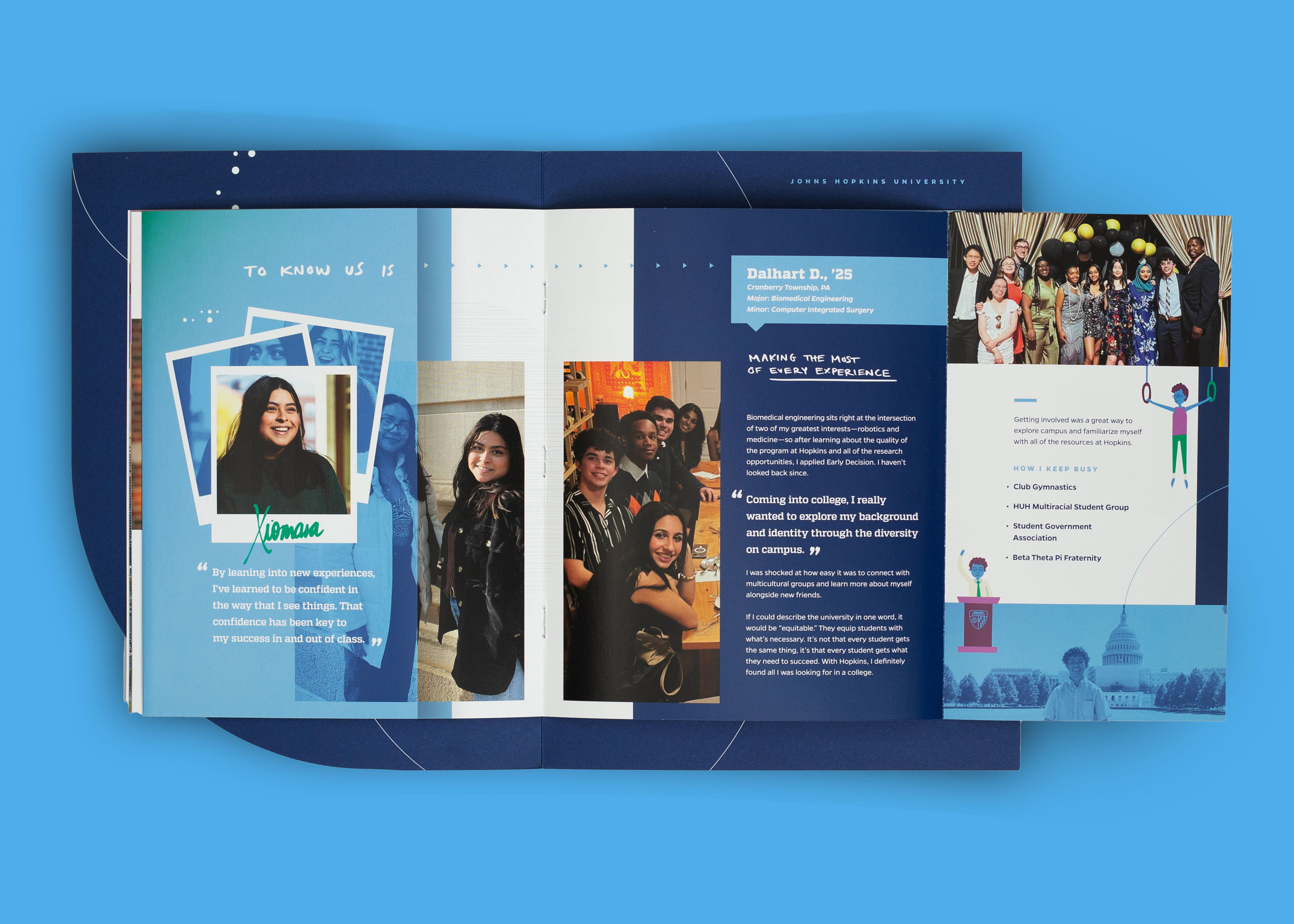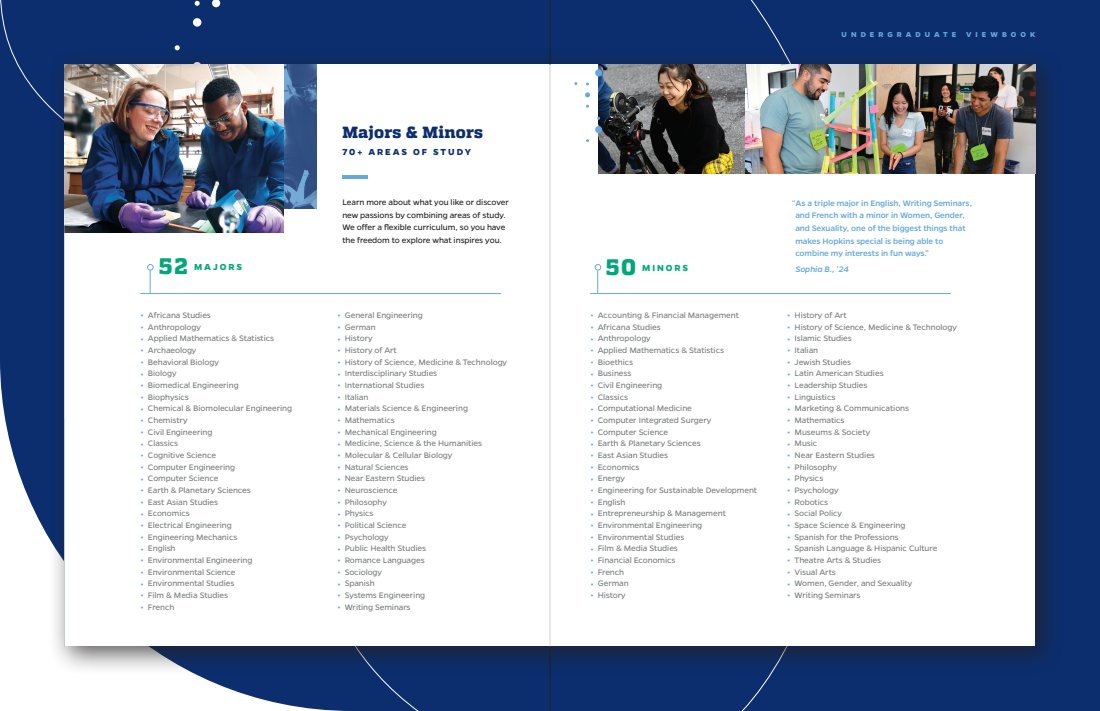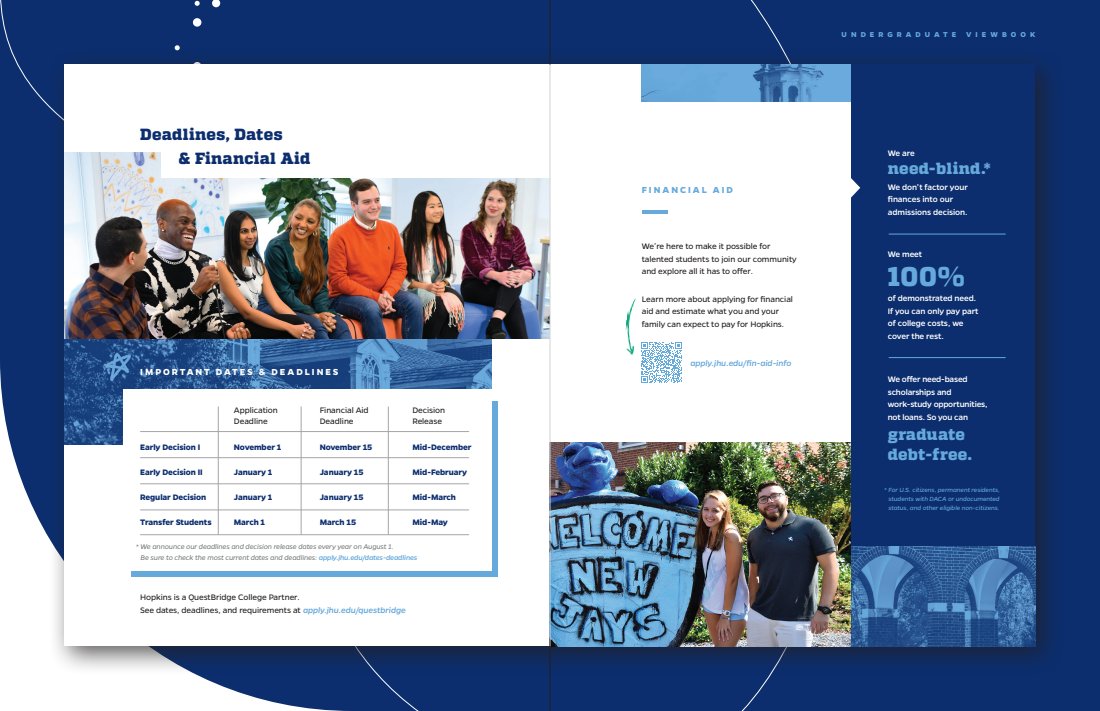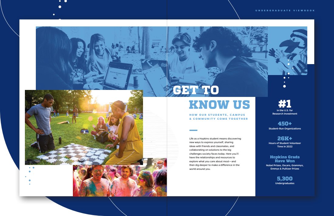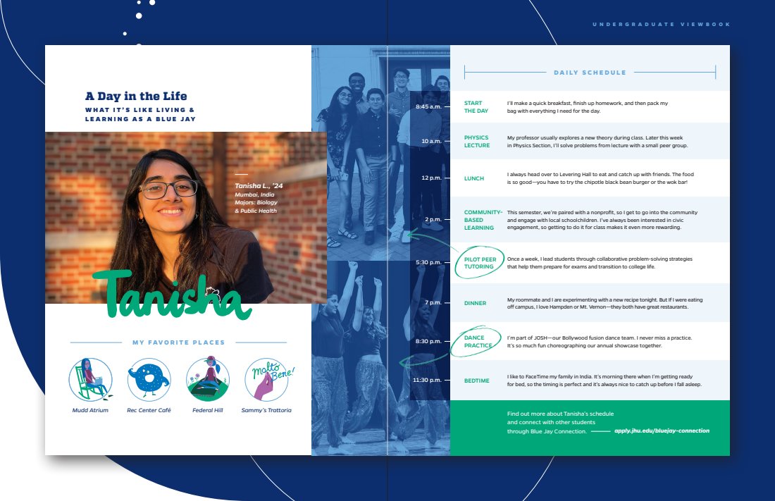 Every touchpoint is huge, but there’s nothing like a great first impression. The viewbook features a range of content describing JHU’s campus, culture, and community. I was able to sit down and interview current students, so a lot of what you’ll read is as authentic as it gets.