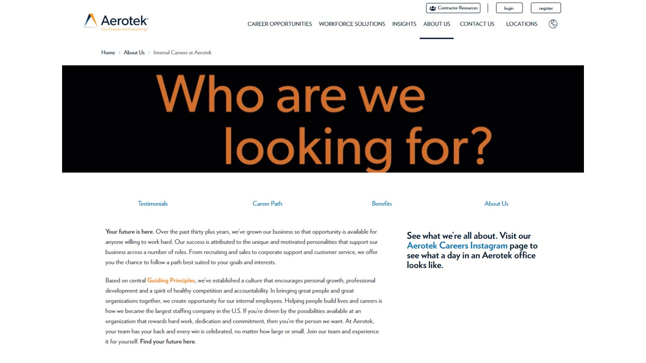 Aerotekās internal recruiting team needed a new website. After interviewing many subject matter experts, I developed copy that reflects our core value propositions.